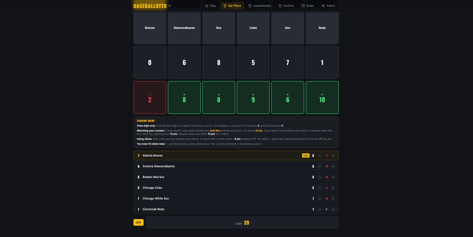 HERE, THE USER EFFICIENTLY USED THE 10 CLICKS TO MATCH THEIR NUMBERS IN 5 OF THE 6 BOXES. WITH THE CLICK PENALTIES, THE BOXES TOTALED 41 (IN GREEN). THE USER CLICKED THE FIRST BOX ONCE TO GET CLOSER BUT RAN OUT OF CLICKS. THE -2, WHICH REMAINED, WAS SUBTRACTED FOR A FINAL SCORE OF 39.