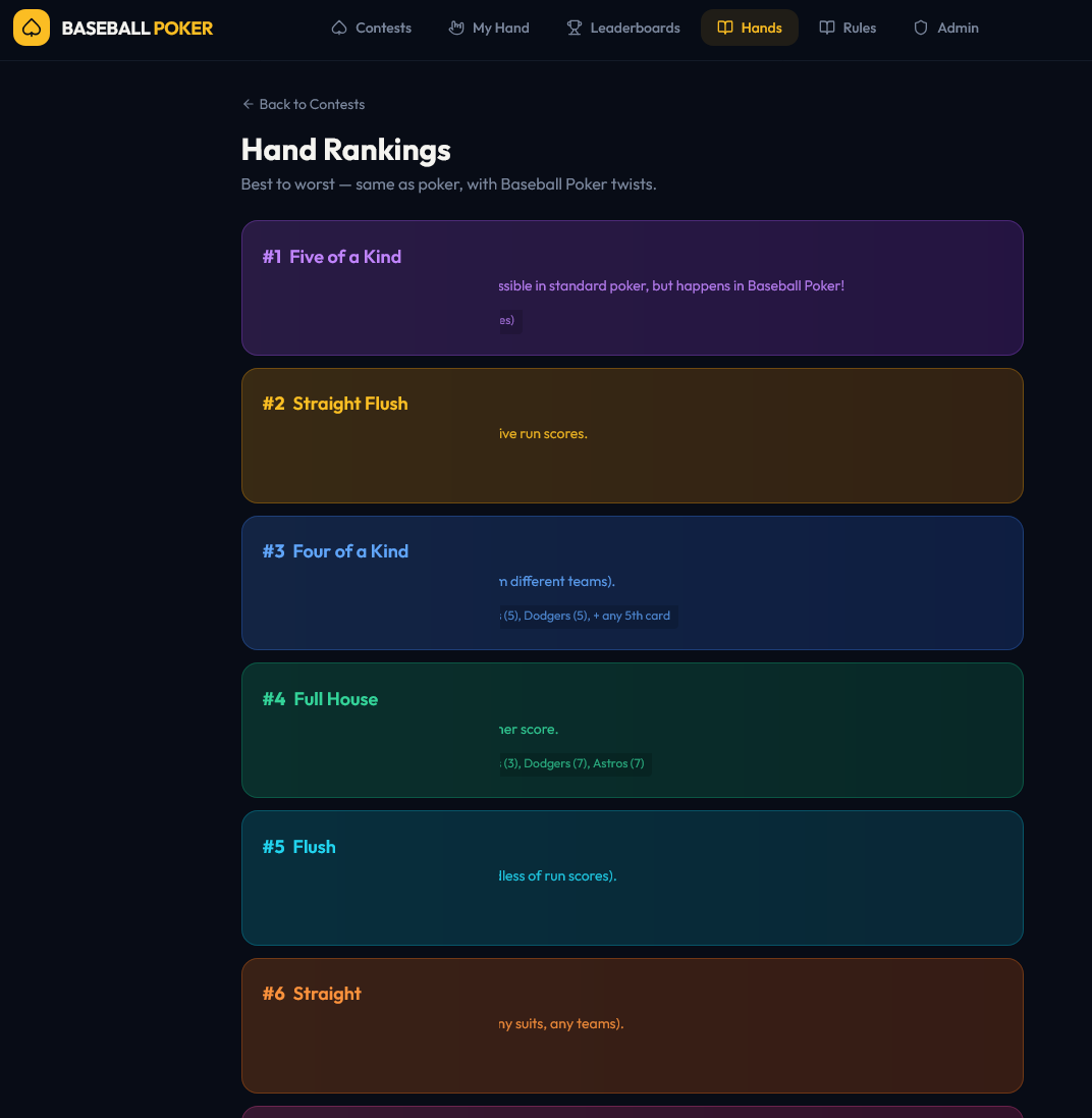 BASEBALL POKER HAND RANKS ARE LISTED