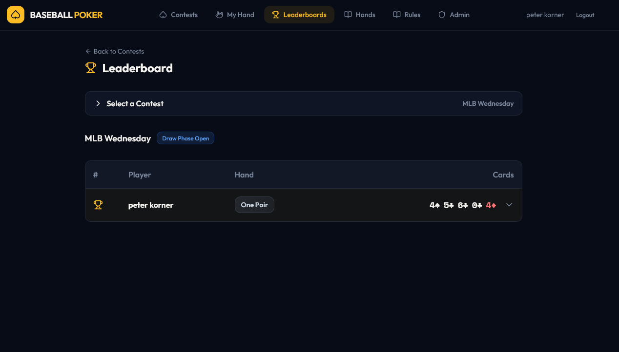 BASEBALL POKER THE HAND IS SUBMITTED AND THE ENTRY HITS THE LEADERBOARD